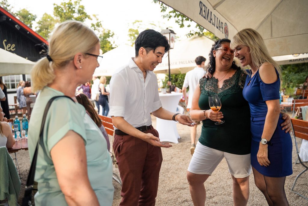 Ich mische mich unter die Gäste und bringe Schwung in die Gespräche.